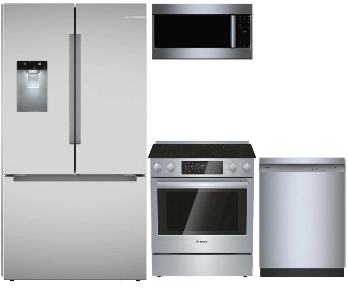 Bosch 4 Piece Stainless Steel Kitchen Package with a French door refrigerator, slide in electric range, built in dishwasher, and over the range microwave. Read More