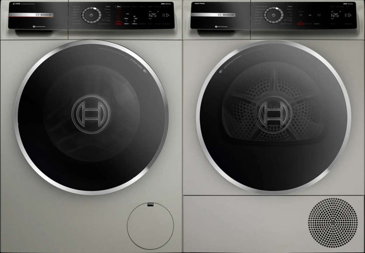 Bosch® 800 Series Silver Inox Front Load Laundry Pair with a 2.4 cu. ft. capacity front load washer and a 4.0 cu. ft. capacity front load electric dryer. Read More