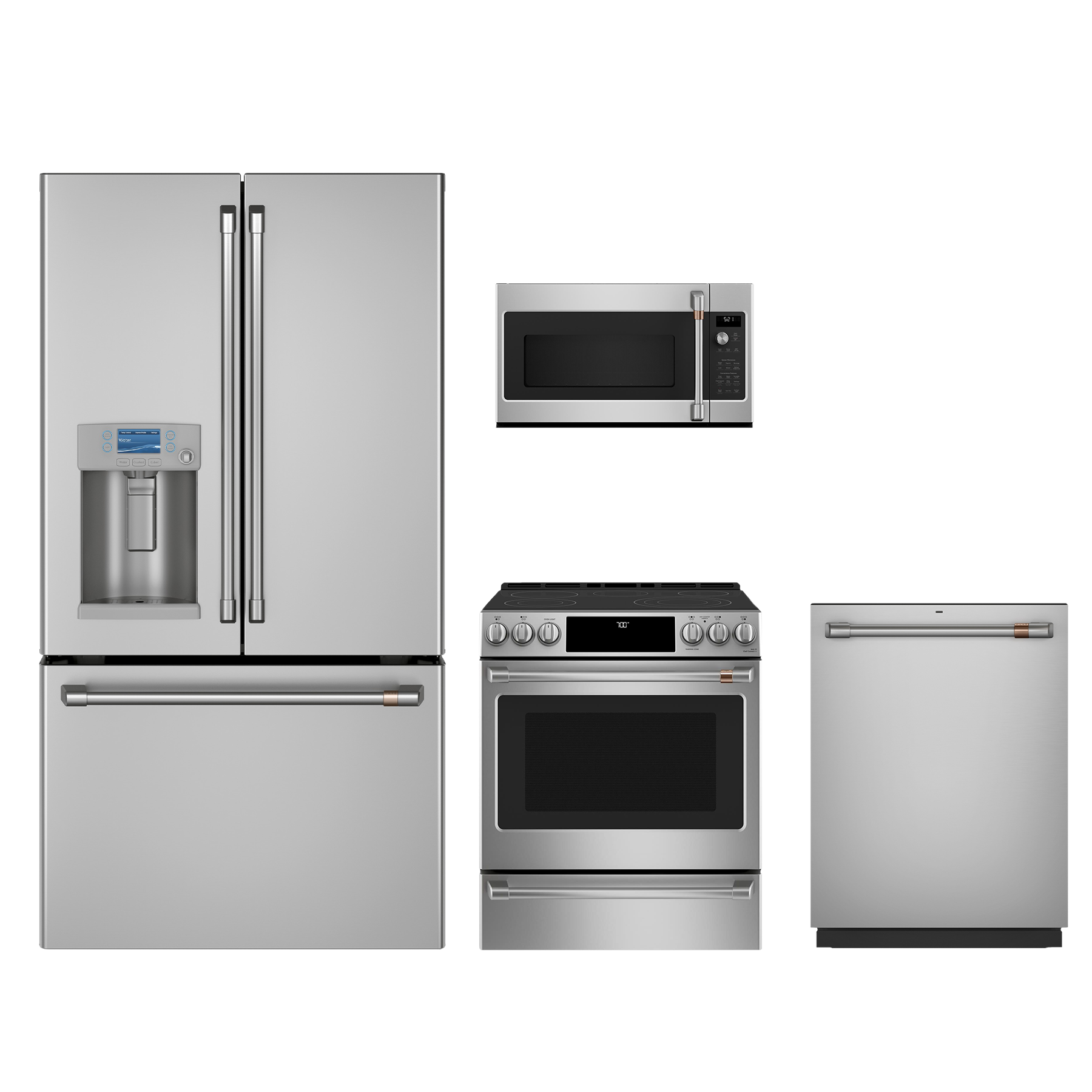 Café™ 4 Piece Stainless Steel Kitchen Package with a counter depth french door refrigerator, slide in electric range, built in dishwasher and over the range microwave Read More