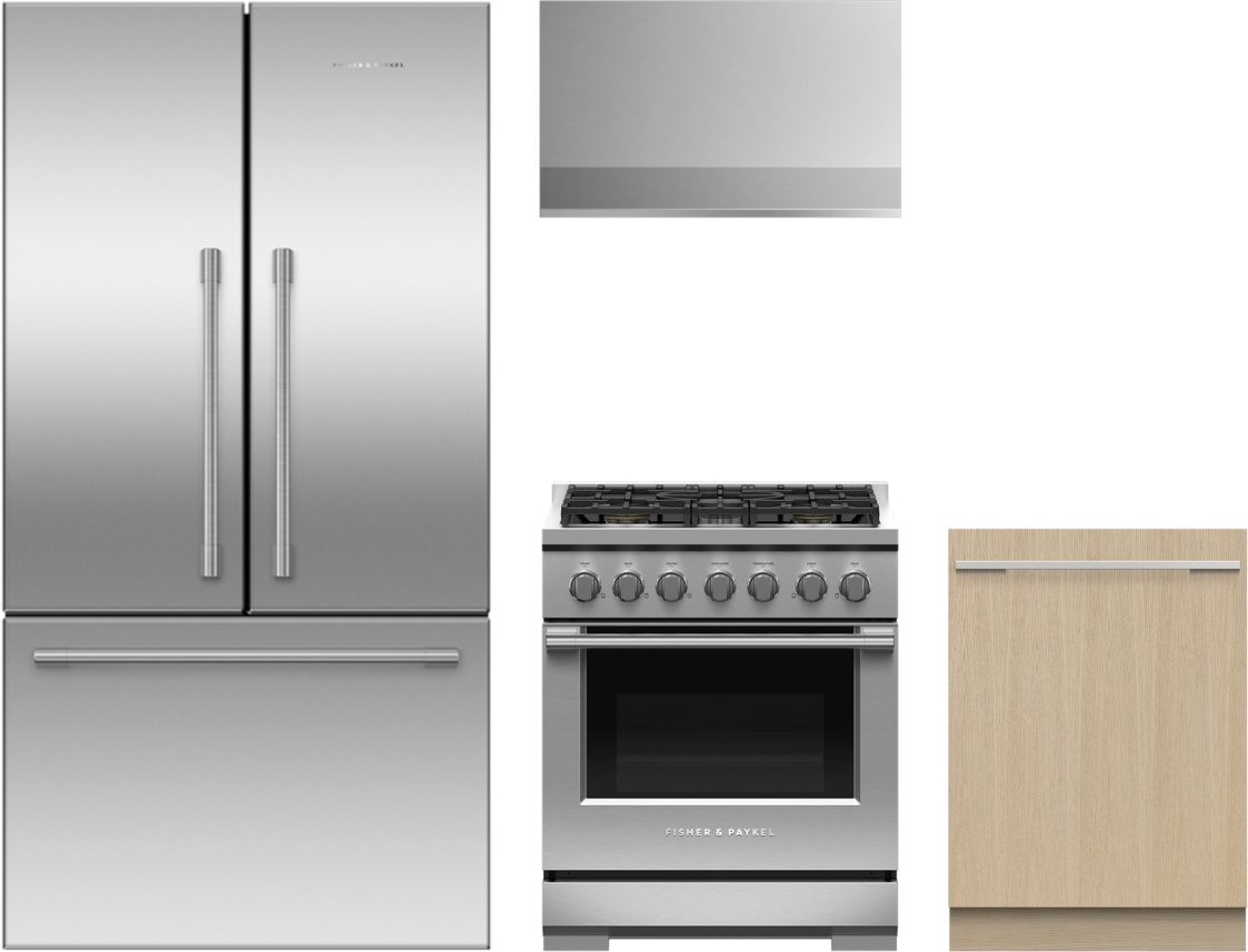 Fisher & Paykel 4 Piece Kitchen Appliance Package with a French door refrigerator, pro style natural gas range, wall hood, and built in dishwasher. Read More