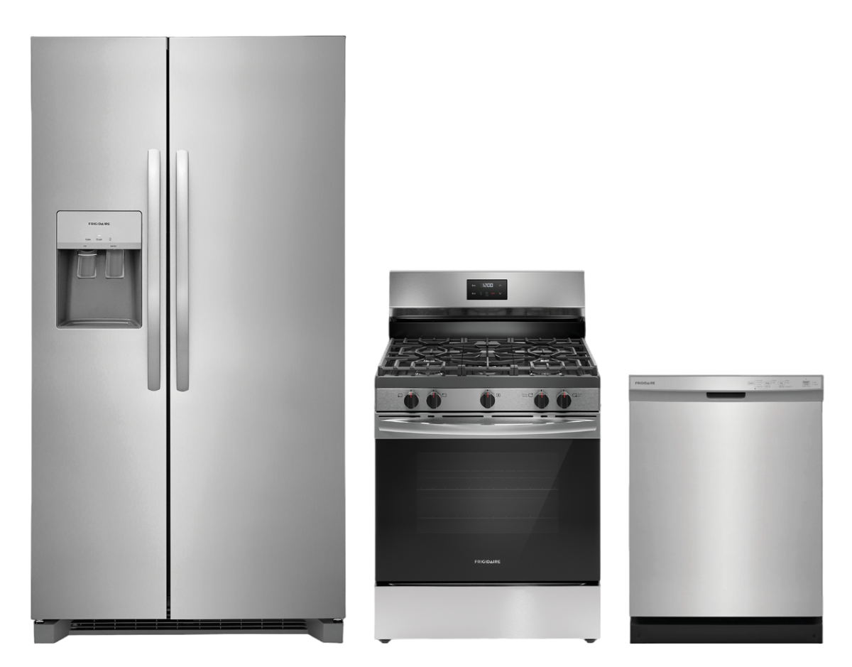 Frigidaire® 3 Piece Stainless Steel Kitchen Package with side-by-side refrigerator, freestanding gas range, and built in dishwasher. Read More