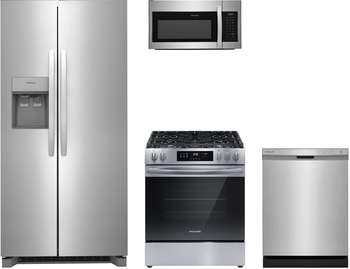 Frigidaire® 4 Piece Stainless Steel Kitchen Package with a side-by-side refrigerator, freestanding gas range, built in dishwasher and over the range microwave. Read More