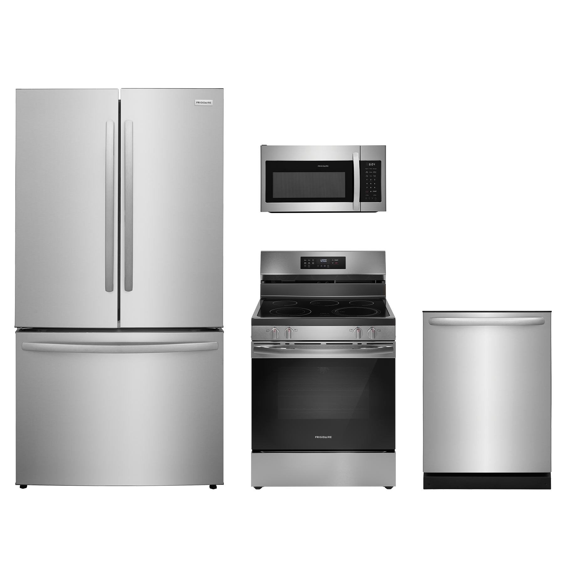 Frigidaire® 4 Piece Stainless Steel Kitchen Package with French door refrigerator, freestanding electric range, built in dishwasher and over the range microwave. Read More