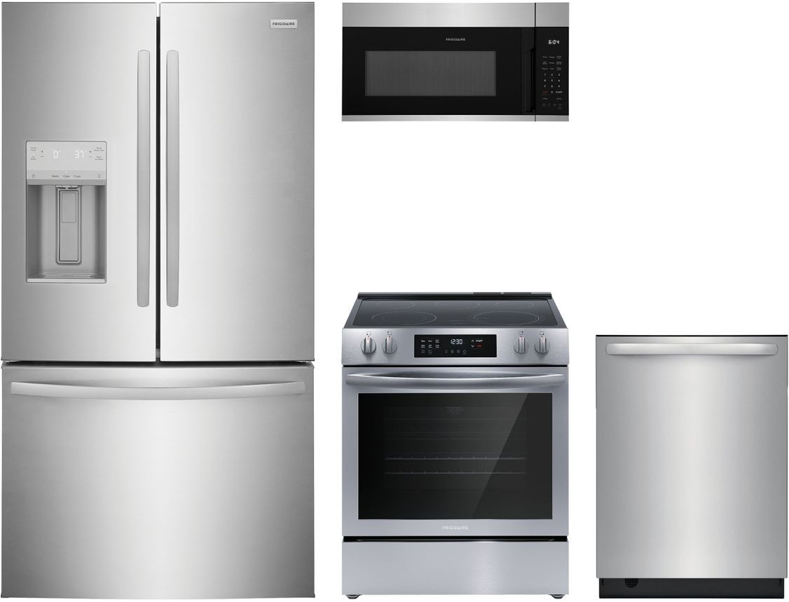 Frigidaire® 4 Piece Stainless Steel Kitchen Package with French Door Refrigerator, Freestanding Electric Range, Built In Dishwasher, and Over The Range Microwave. Read More