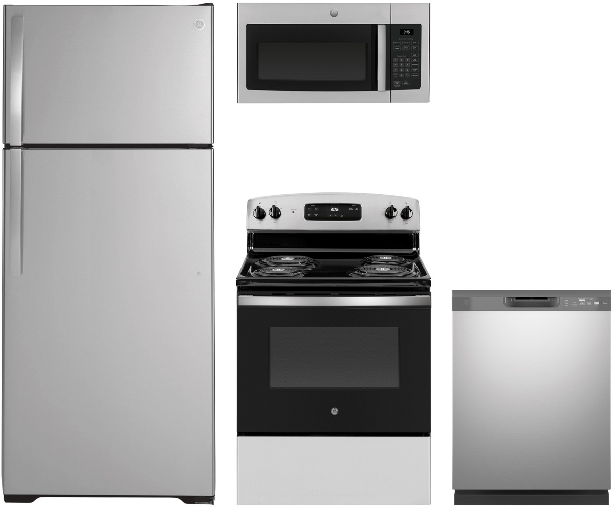 GE® 4 Piece Stainless Steel Kitchen Package with top freezer refrigerator, freestanding electric range, built in dishwasher and over the range microwave. Read More
