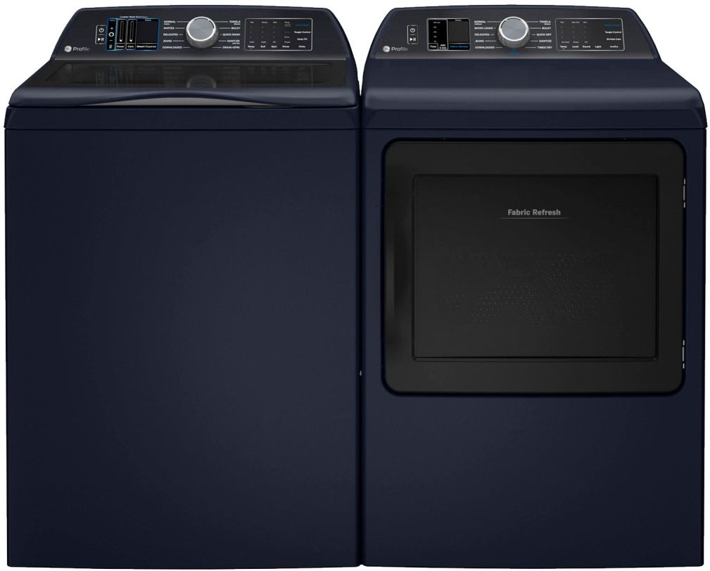 GE Profile™ Royal Sapphire Blue Laundry Pair with a 5.4 cu. ft. capacity top load washer and a 7.3 cu. ft. capacity front load gas dryer. Read More