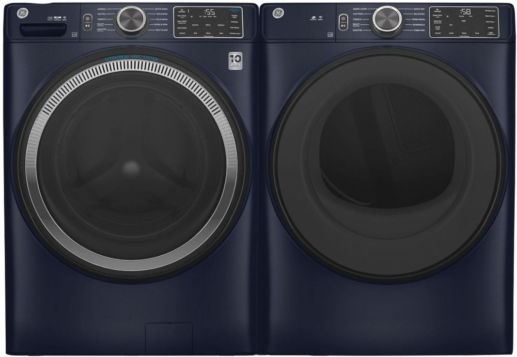 GE® Sapphire Blue Front Load Laundry Pair with a 4.8 cu. ft. capacity front load washer and a 7.8 cu. ft. capacity front load electric dryer. Read More