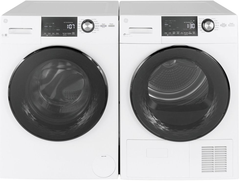 GE® White Front Load Laundry Pair with a 2.4 cu. ft. capacity front load washer and a 4.1 cu. ft. capacity front load electric dryer. Read More