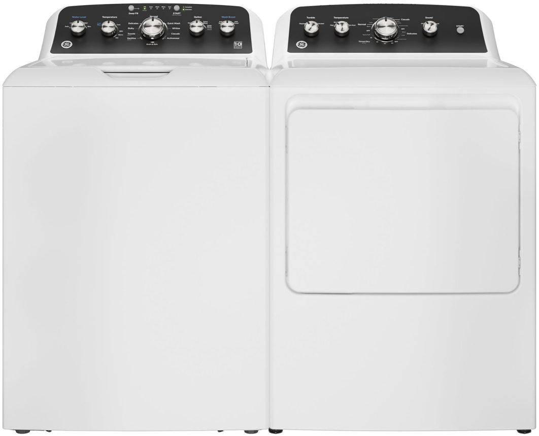 GE® White Laundry Pair with a 4.5 cu. ft. capacity top load washer and a 7.2 cu. ft. capacity front load gas dryer. Read More
