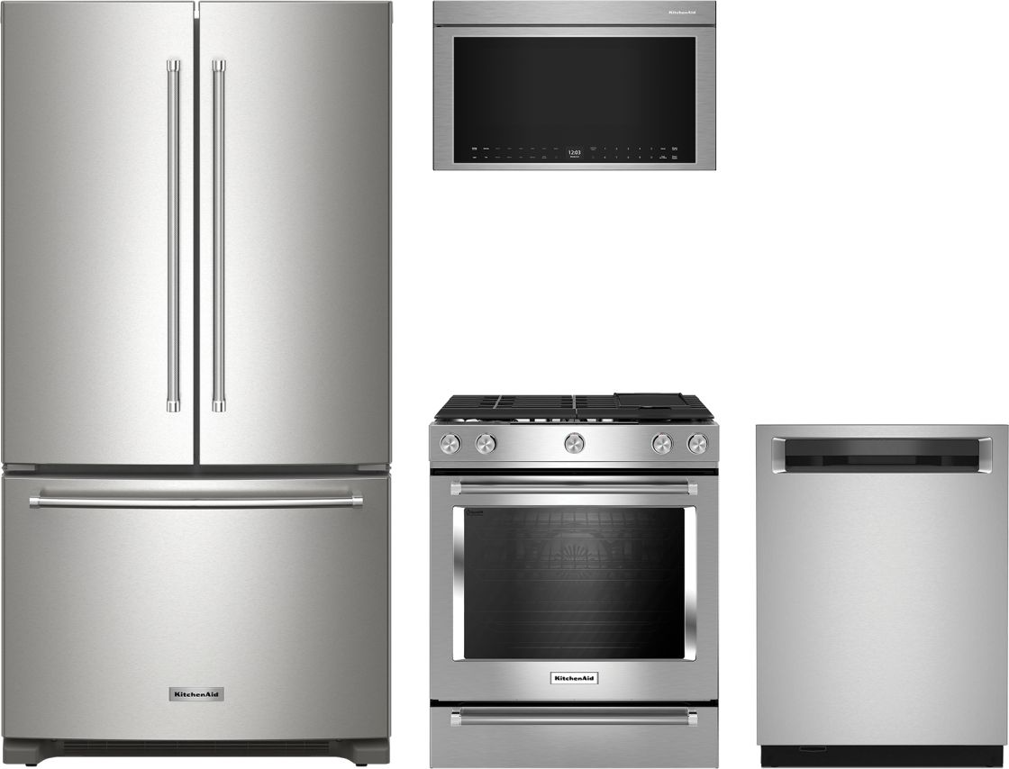 KitchenAid® 4 Piece Stainless Steel Kitchen Package with a French door refrigerator, slide in dual fuel range, over the range microwave and built in dishwasher. Read More