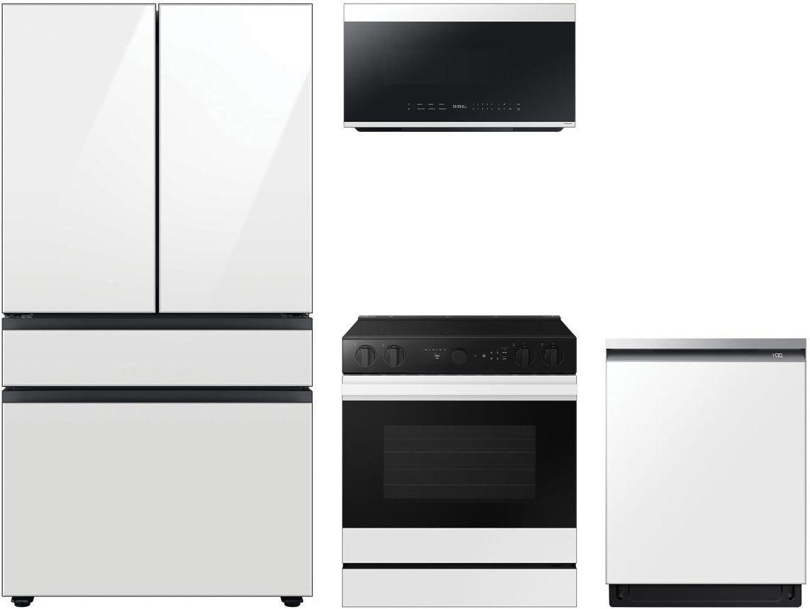 Samsung 4 Piece Stainless Steel Kitchen Package with a french door refrigerator, slide in electric range, built in dishwasher and over the range microwave Read More