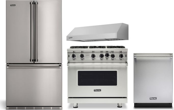 Viking® 4 Piece Stainless Steel Kitchen Package with a french door refrigerator, pro style gas range, built in dishwasher, and range hood Read More