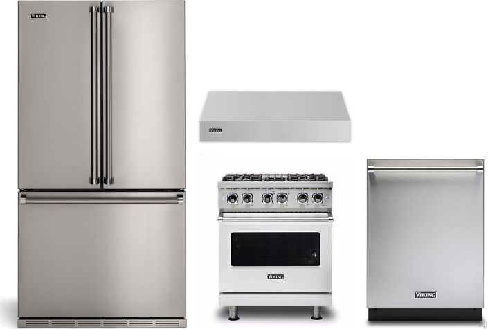 Viking® 4 Piece Stainless Steel Kitchen Package with a french door refrigerator, pro style dual fuel range, built in dishwasher, and range hood Read More