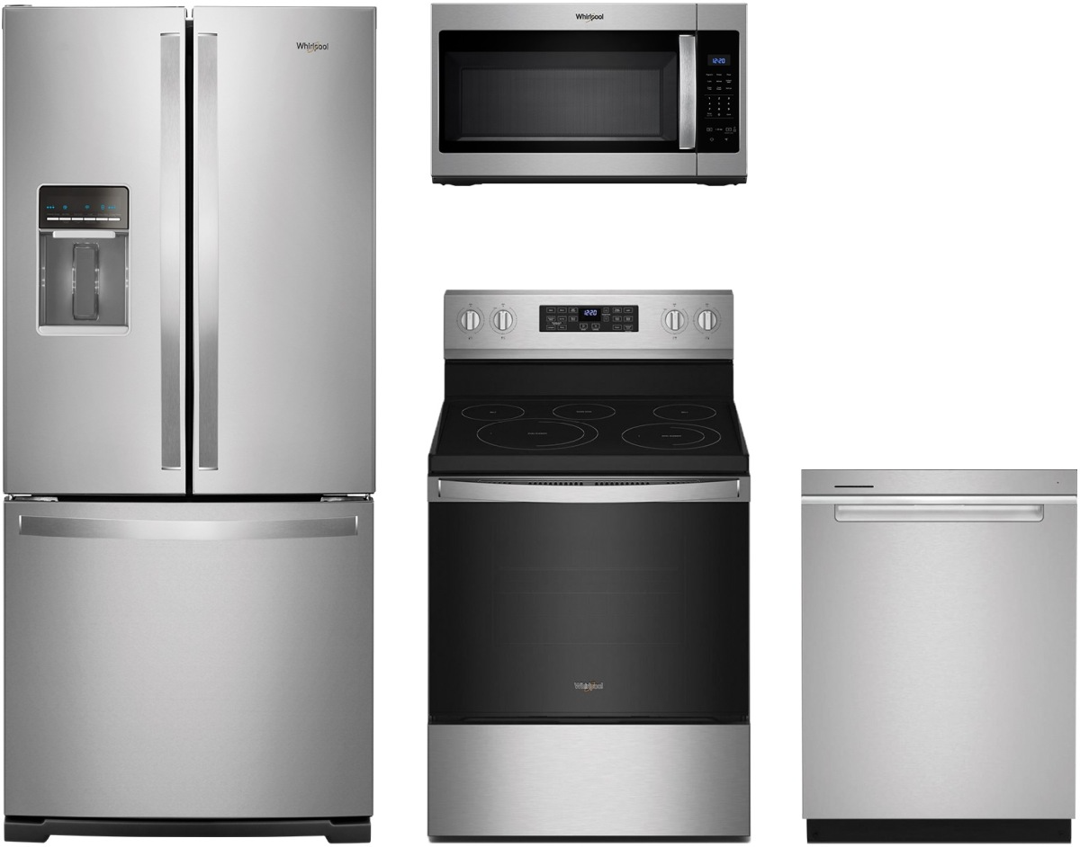 Whirlpool® 4 Piece Fingerprint Resistant Stainless Steel Kitchen Package with french door refrigerator, free standing electric range, over the range microwave, and built in dishwasher Read More