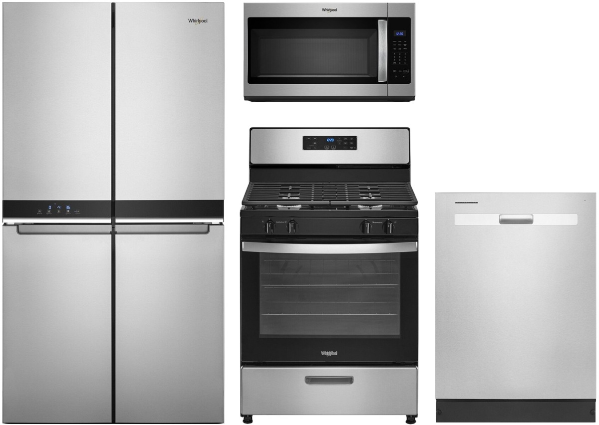 Whirlpool® 4 Piece Fingerprint Resistant Stainless Steel Kitchen Package with French Door refrigerator, free standing gas range, over the range microwave, and built in dishwasher Read More